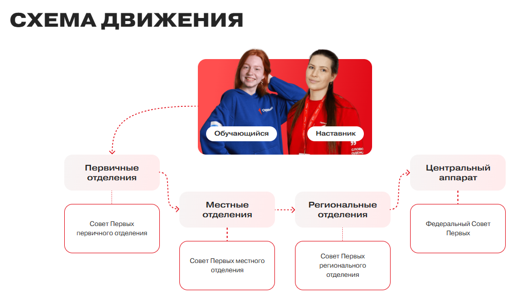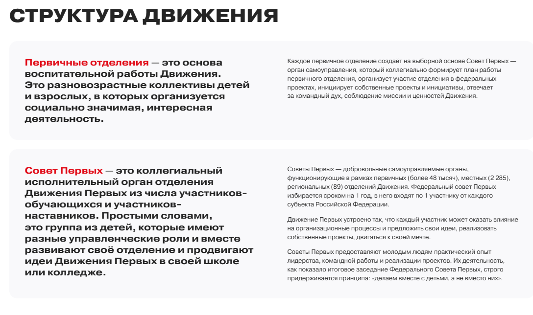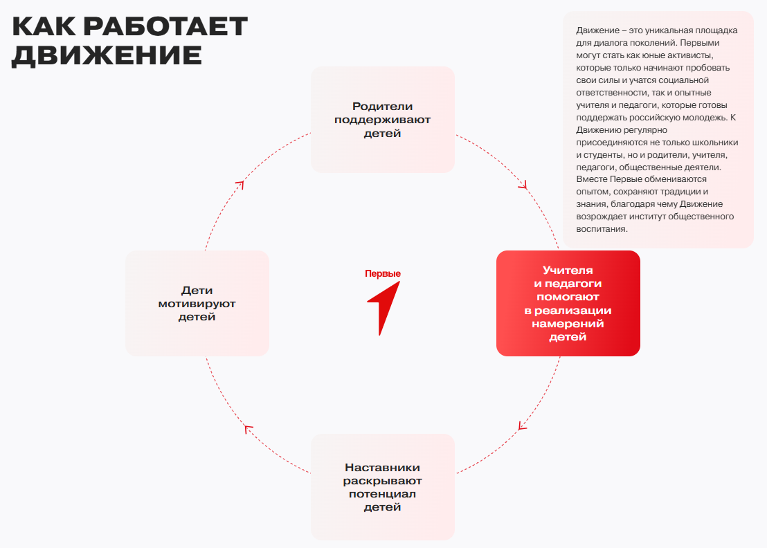 Движение Первых – единственная общественная организация в стране, где дети и взрослые остаются равноправными участниками. Принцип соавторства дает Движению возможность объединять разные поколения. Всё, что делают люди в Движении – маленькие и взрослые – направлено на помощь обществу и социальный результат. Добрые дела Первых – полезное занятие, вклад в благоустройство и развитие России.